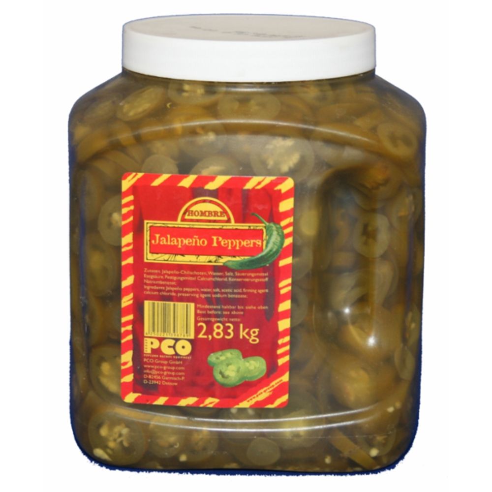 Hombre Jalapeño Peppers gibt es im 2,83 kg-Glas (als 6-er Set pro Karton). Die grünen Früchtchen verleihen Nachos und Dips eine Extraportion Schärfe.