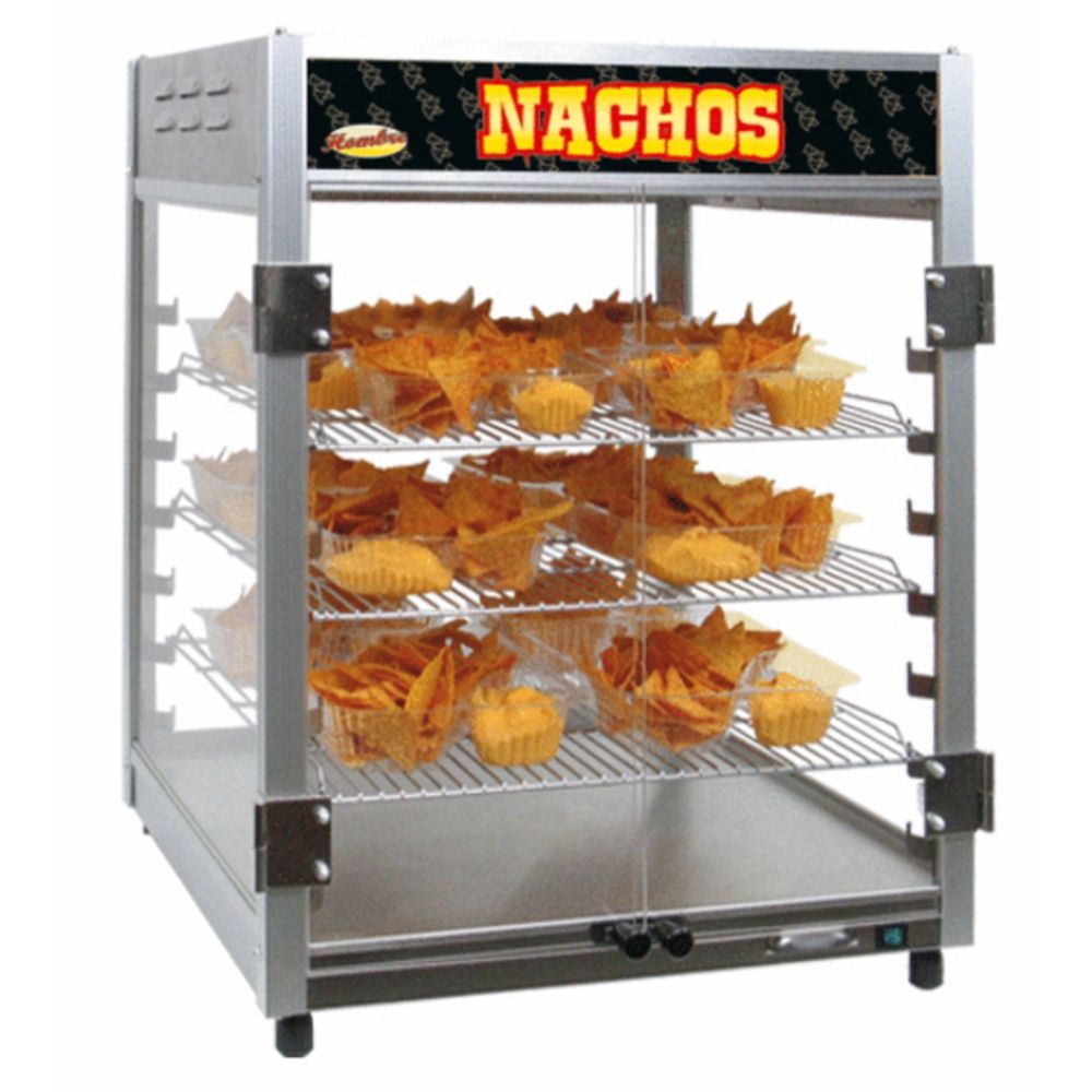 Nacho Combo Heater Gold Medal (medium) has three adjustable shelves where preportioned nachos can be warmed up. Ideal for the back buffet. 520 W; 230 V. Dimensions: D 47, W 47, H 59 cm. Weight: 26.4 kg.